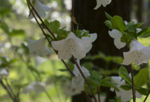 太平洋側の山地、主にブナ林に多く生息するこの植物は、葉の下に下を向いた白い花を咲かせる。覗き込むようにして鑑賞すると花びらが造る五角形が美しく、透き通るような白さには気品がある。それもそのはず、皇室のお印として用いられる高貴な花だという。枝の先端に5枚の葉を付けることから、ゴヨウツツジとも呼ばれている。今日はシロヤシオを鑑賞して、日本の心を感じた気がした。